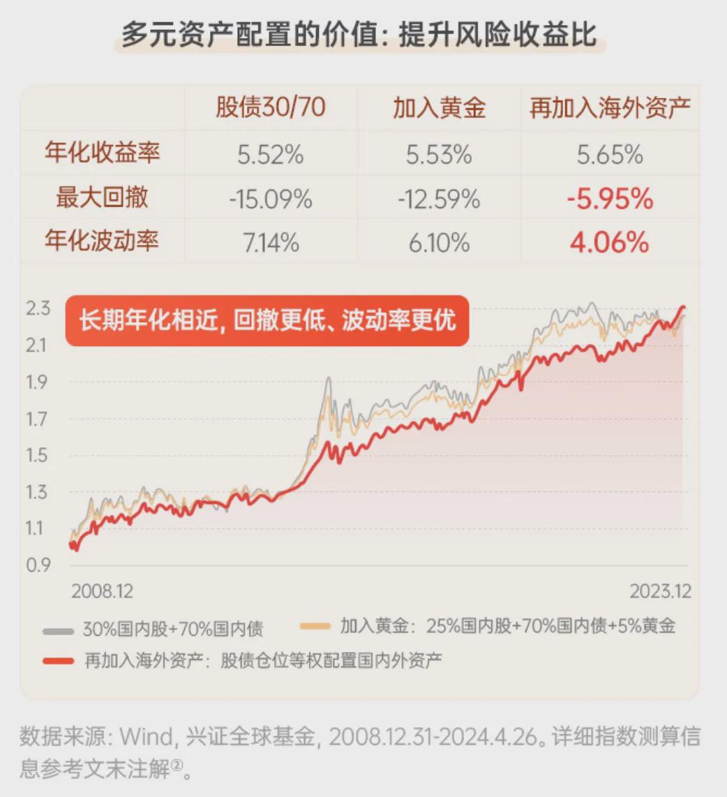 这便是经典的“全天候”策略思想,也是桥水基金瑞·达利欧长期制胜的秘籍。学术上的测算也验证了这一点:在传统的“股债30/70”组合里,逐步加入黄金和海外资产后,长期年化收益率相近,但最大回撤和年化波动率均显著下降,风险收益比显著提升。