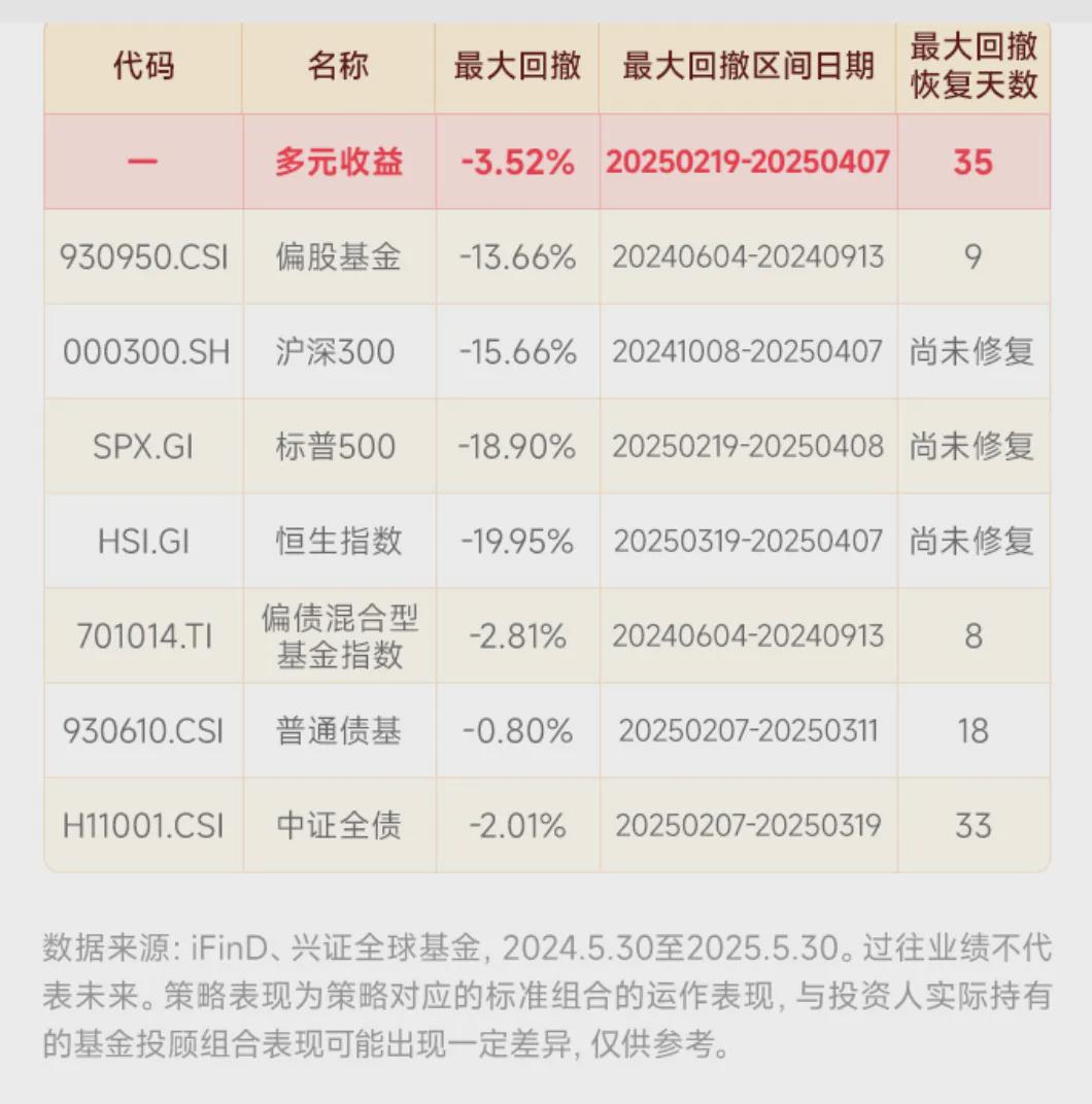 「多元收益」投顾策略成立1年期间,遭遇过2025年4月由关税战引发的全球市场巨震,最大回撤仅为-3.52%,同期沪深300指数最大回撤 -15.66%,标普500为 -18.90%,恒生指数为-19.95%。