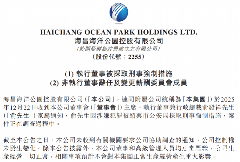 海昌海洋公园表示,截至目前,未收到有关机关要求公司协助调查的通知,公司控制权未发生变化。上述公司皆称,除公告披露外,公司董事和高级管理人员均正常履职,公司生产经营一切正常,相关事项预计不会对集团正常生产经营产生重大影响。俞发祥拟委托公司执行董事欧阳明代为行使董事会主席、执行董事兼行政总裁的职责直至另行通知为止。