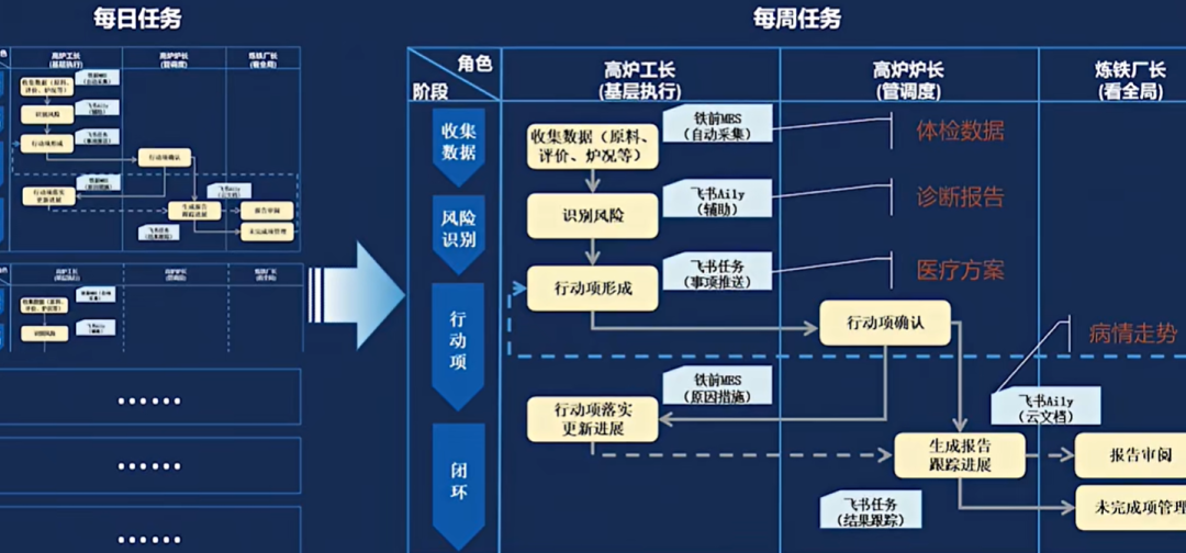 但如今,他们用飞书搭建的AI高炉智析系统,让交接班报告从30分钟缩至5分钟,风险自动生成任务派到责任人手机,每一次故障都被沉淀为“高炉病例”,AI甚至能逆向溯源、精准诊断。