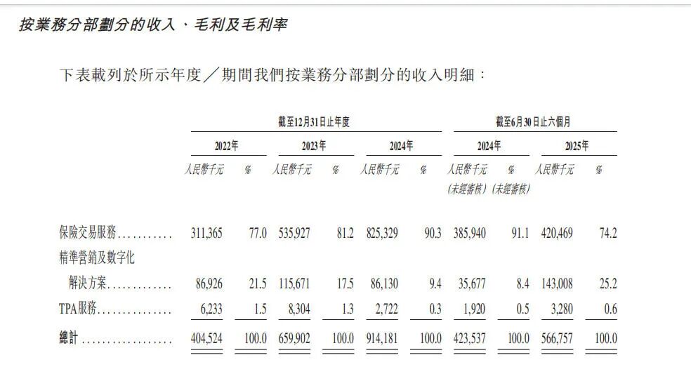 业绩层面,聆讯后资料集显示,公司2022年-2024年营业收入分别为4.05亿元、6.60亿元、9.14亿元,今年上半年为5.67亿元;同期净利润分别为-0.25亿元、-0.17亿元、-0.28亿元,上半年净利润为-0.22亿元。此外,公司2022年-2024年的毛利率分别为8.3%、7.9%、9.1%,与其他已上市的保险中介机构相比而言偏低。