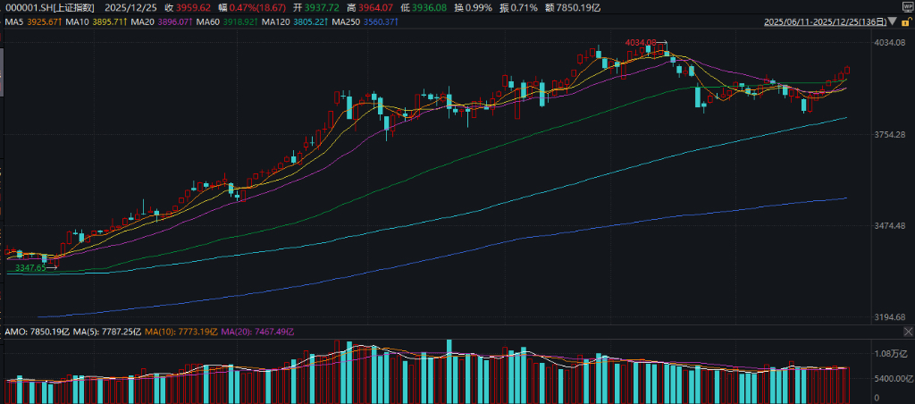 在触及年中高点4034.08点后,沪指经历一个月盘整,年末再度走出亮眼阳线。截至12月25日收盘,沪指上涨0.47%,报3959.62点。盘面上,全市场超3700只个股上涨,商业航天概念股掀涨停潮,机器人概念股爆发,价值股搭台、多主线轮动特征明显。