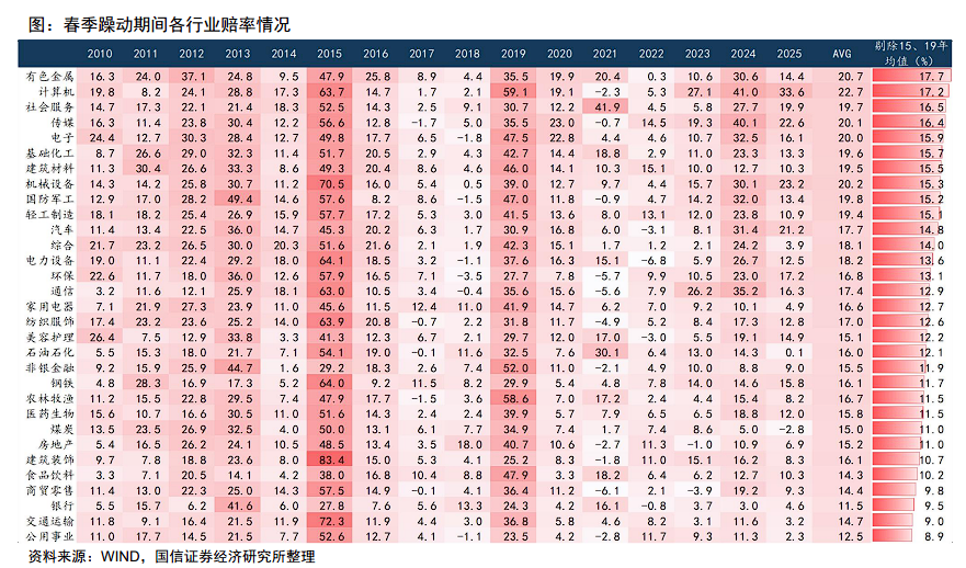尽管乐观情绪升温,但行情启动的时点与强度仍是市场关注的焦点。国信证券的复盘研究显示,A股春季躁动行情近年抢跑特征明显,主涨段覆盖春节至两会期间概率最高,其中有色金属、计算机、电子等行业历史赔率占优。报告指出,在分子端不弱、流动性改善且外部冲击有限的条件下,今年春季躁动大概率不会太弱,且呈现全球股市共振特征。