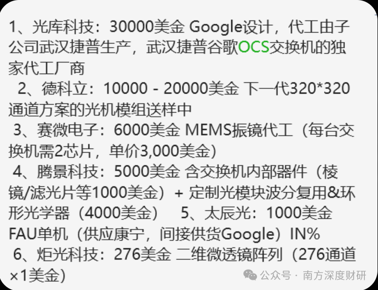 有说法是OCS单台的成本在6至7万美金,或者10至15万美金。谷歌预计明年出货是2万台,如果市场能达到10万台左右,那么就是100亿-150亿美元的需求。