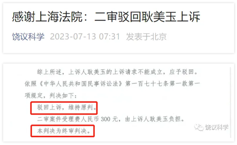 ▲耿美玉起诉饶毅名誉侵权案败诉。