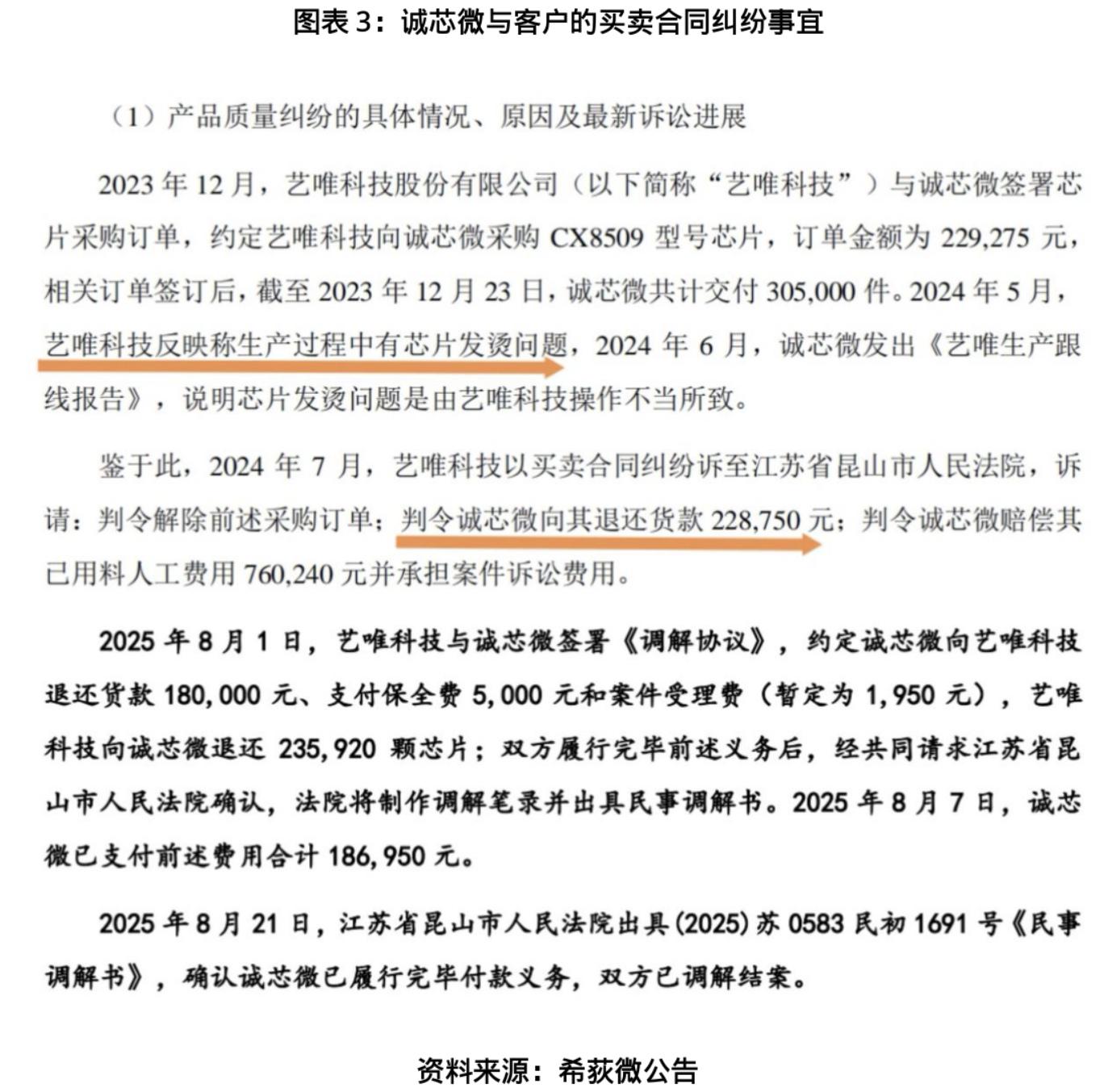 业绩波动之外,诚芯微的产品品控隐患也浮出水面。公告显示,2024年7月,因CX8509型号芯片发烫问题,诚芯微被艺唯科技股份有限公司起诉索赔货款与用料人工费用合计98.9万元。尽管双方于2025年8月达成调解协议,诚芯微退还货款18万元并支付相关费用6.95万元,但这一事件暴露出诚芯微产品质量管控的漏洞。