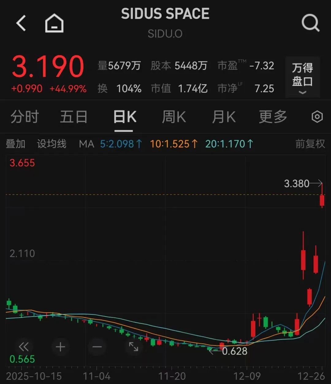太空概念股Sidus Space高开逾30%,盘初一度涨超50%,现涨近45%。