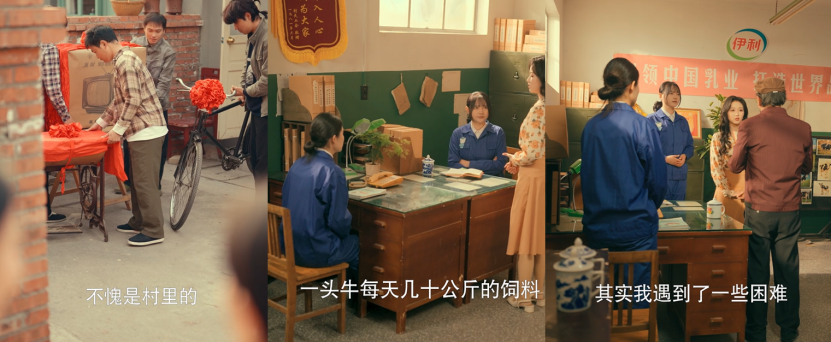 间接润物细无声也有,比如在特定的时代背景下,一些符合时代记忆的特殊物件出现在画面中,仿佛将观众瞬间拉回那个充满“中式梦核”的年代,叠加不经意的品牌露出,当观众回过神后,也会意识到伊利近三十年来的陪伴,大大提升了品牌好感度。