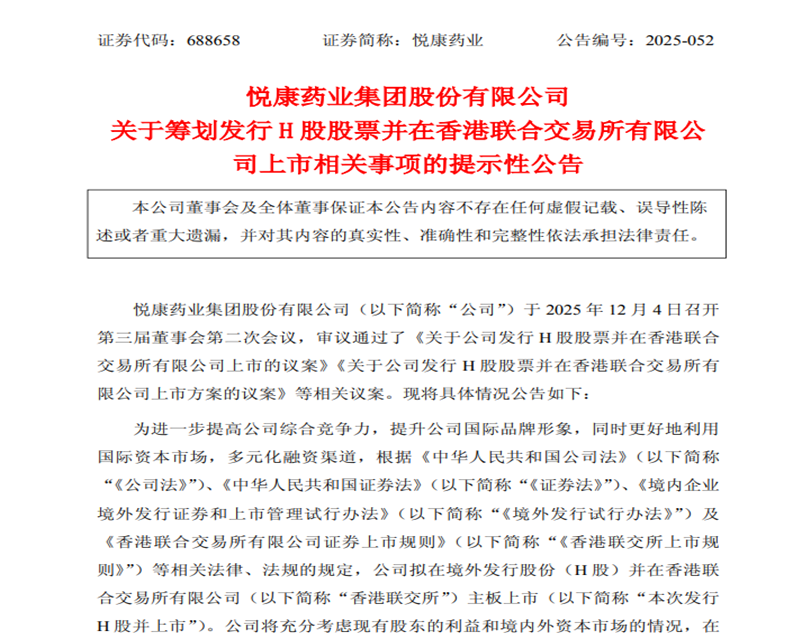 近日,悦康药业公告称拟在港交所主板发行H股上市,旨在提升国际品牌形象并拓宽融资渠道。该方案尚需股东大会审议及境内外监管机构批准,公司计划在24个月有效期内择机推进。