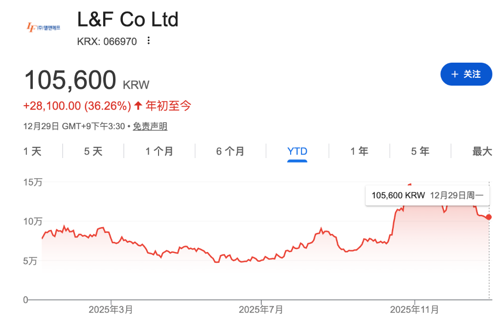 年初至今,L&F股价涨超36%,落后于韩国综合股价指数(KOSPI)76%的涨幅。