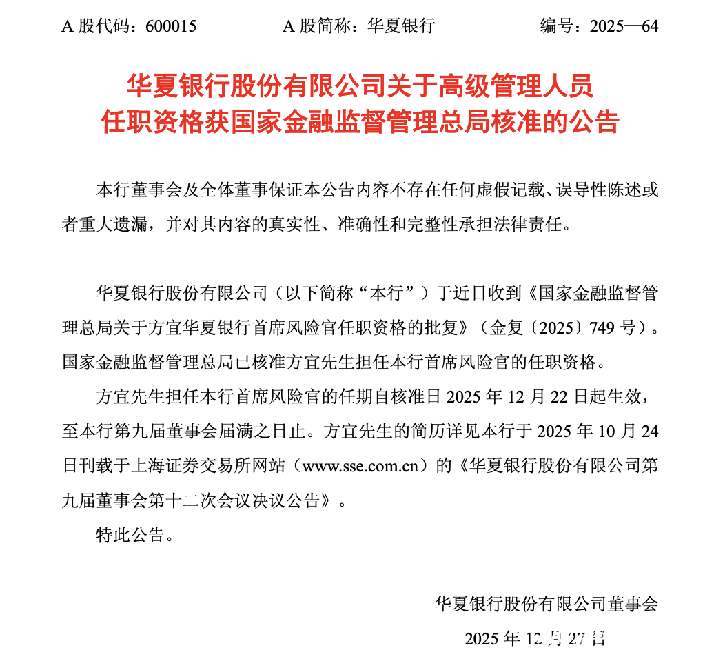2025年12月27日,华夏银行股份有限公司(600015.SH)发布公告披露,国家金融监督管理总局已正式核准方宜担任该行首席风险官的任职资格,任期自2025年12月22日起至第九届董事会届满之日止。