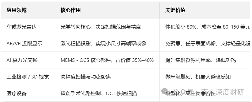 MEMS微振镜因为能精确控制光束的方向,是激光雷达、AR/VR、光通信等场景的“光学心脏”,当前在车载激光雷达与AI算力光交换、工业、机器人等领域是确定的爆发点。