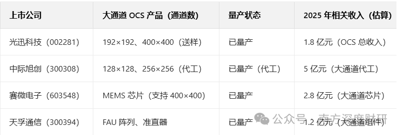 根据资料统计,目前实现大通道OCS量产的公司有光迅科技、中际旭创、赛微电子、天孚通信。