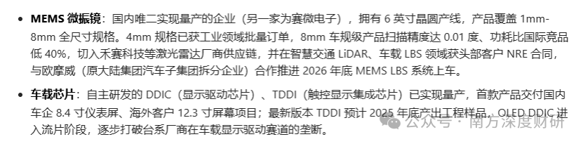 公司切入了禾赛科技等激光雷达厂商供应链,并在智慧交通LiDAR、车载LBS领域获头部客户NRE合同,与欧摩威(原大陆集团汽车子集团拆分企业)合作推进2026年底MEMS LBS系统上车。