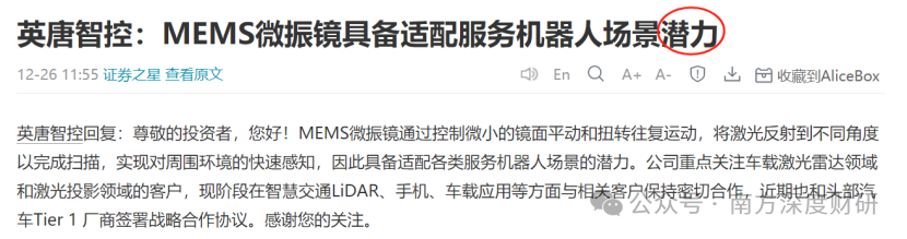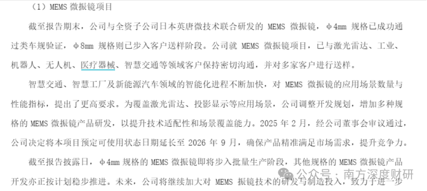 根据公司公告,自研的MEMS微振镜已实现量产并获得工业领域批量订单,4nm规格的微振镜也即将进入生产阶段,其他规格的已经完成车厂、激光雷达整机厂等领域的客户验证工作,即将实现量产。