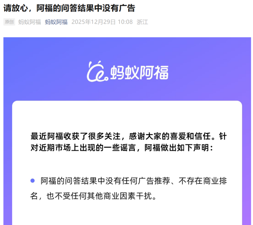 蚂蚁阿福2025年12月29日,发布的声明里坚称,其问答结果“没有任何广告推荐、不存在商业排名,也不受任何其他商业因素干扰”。