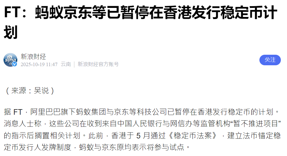 另外蜜妹注意到,就在蚂蚁集团全力布局健康领域的同时,其在金融创新领域的探索却受到了明确限制。2025年10月,包括蚂蚁集团在内的多家中国科技巨头,已暂停在香港推进稳定币项目。