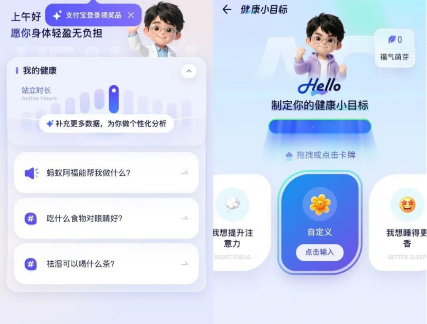 再就是今年12月15日,“AQ”正式改名“蚂蚁阿福”,名字取“健康是福”的口彩,Slogan直接喊“健康大小事,阿福帮你讲明白”。icon换成圆滚滚、自带笑脸的蓝色小药箱,强化“朋友感”。