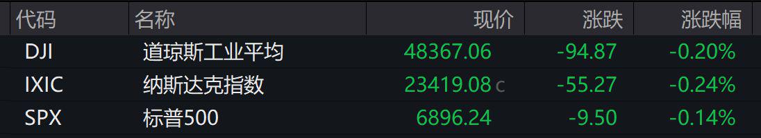 美东时间12月30日16:00(北京时间12月31日5:00),道指收跌94.87点,报48367.06点,跌幅为0.2%;纳指收跌55.27点,报23419.08点,跌幅为0.24%;标普500指数收跌9.5点,报6896.24点,跌幅为0.14%。