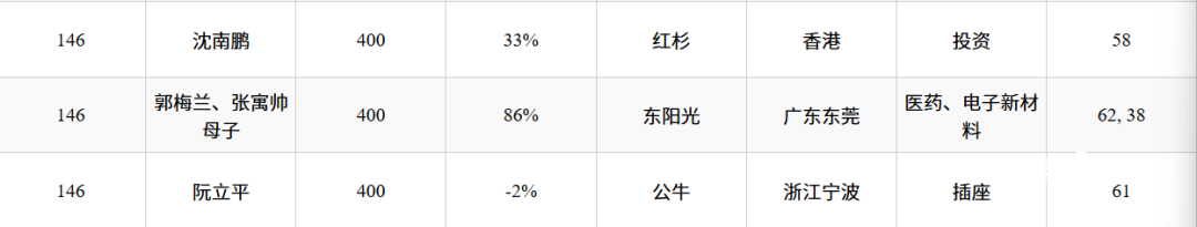 此前,东阳光实际控制人之一的张中能于2020年因病逝世,张寓帅继承了张中能控制的上市公司权益,东阳光实际控制人由此变更为郭梅兰、张寓帅母子。南都记者注意到,今年10月,二人以400亿元的财富值排名登上2025胡润百富榜,位列第146位,成为东莞首富。