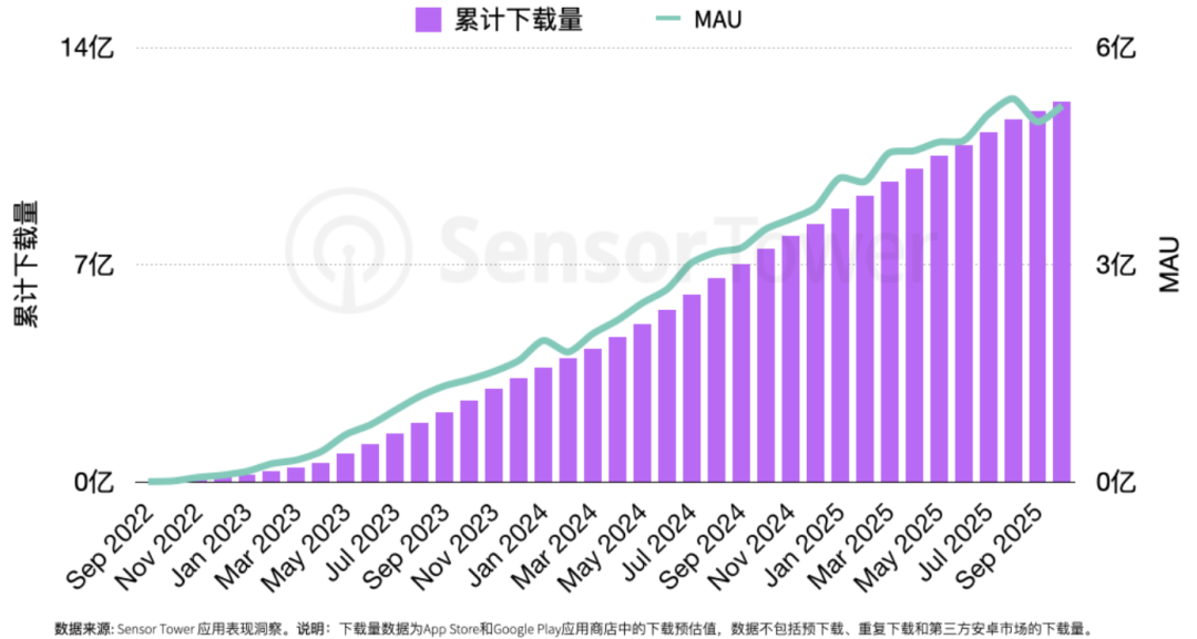 2025年三季度,Temu的GMV同比增长42%至1680亿,亏损持续收窄。而按照Sensor Tower的《2025年购物季电商应用市场洞察》的口径,2025年1-10月,Temu的月活用户达到5.3亿,蝉联全球电商应用下载榜、月活跃用户增长榜的冠军。