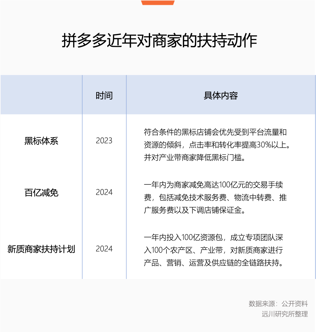 2024年8月,拼多多推出了面向商家的“千亿扶持”——“新质商家扶持计划”,通过资金、技术、营销等多方面的扶持,为产业带商家的转型铺路。