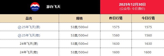 截至12月30日,据今日酒价数据显示,2025年出厂的53度飞天茅台原箱装单瓶报价为1575元,同规格散瓶装报价为1560元/瓶。