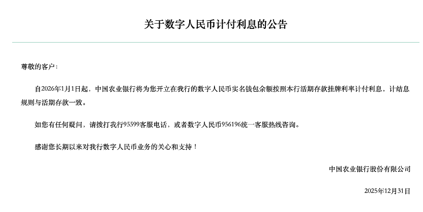 2025年12月31日,工商银行、农业银行、交通银行公告,自2026年1月1日起,为数字人民币实名钱包余额按照活期存款挂牌利率计付利息,计结息规则与活期存款一致。