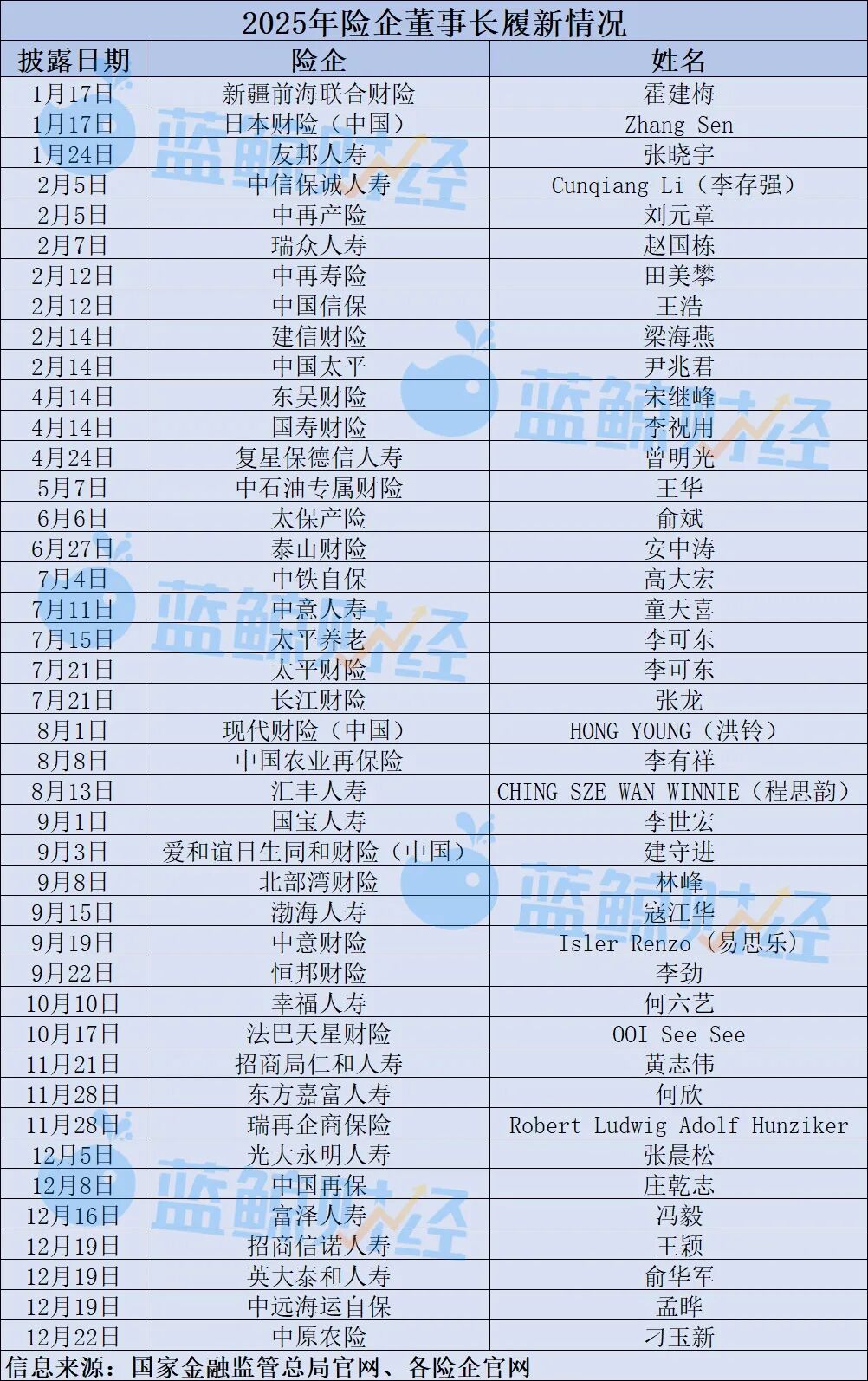 2025年,保险行业迈入深度调整期,险企“一把手”换防提速。蓝鲸新闻记者根据监管批复不完全梳理,年内至少有42家险企迎来新任董事长。