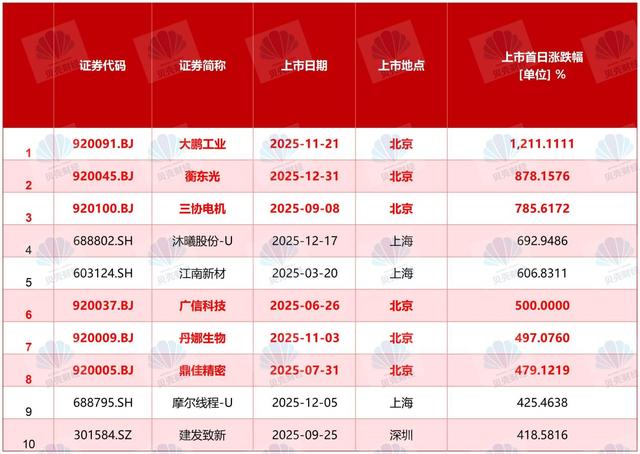 新股方面,Wind显示,2025年全年共有116只新股登陆A股市场,其中北交所贡献了26只。这26只新股在上市首日均表现强劲,涨幅全部超过150%,实现股价翻番。表现尤为突出的是2025年11月21日上市的大鹏工业(920091.BJ),其在全部A股新股中摘得首日涨幅榜之首。此外,在116只新股首日涨幅前十名中,来自北交所的新股,占据六席、成为绝对多数。