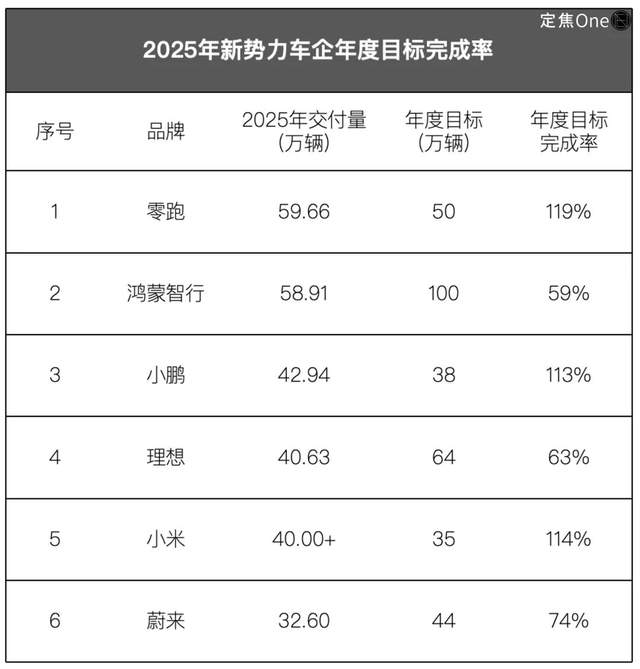 从年度目标完成率来看,分化更为明显。零跑、小鹏和小米均超额完成,其中零跑和小鹏的完成率更是超过了110%;蔚来完成率有74%,摆脱了垫底的尴尬;而理想和鸿蒙智行显然低估了市场的残酷程度,完成率均未超过65%。