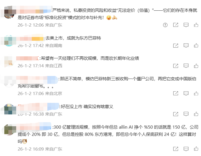 还有网友则表达了不屑:真敢吹!评论区则回复:东方港湾这规模和赚钱能力吊打一半上市公司;有网友表示:希望有一天,经理们不再吹规模,而是吹长期年化业绩。