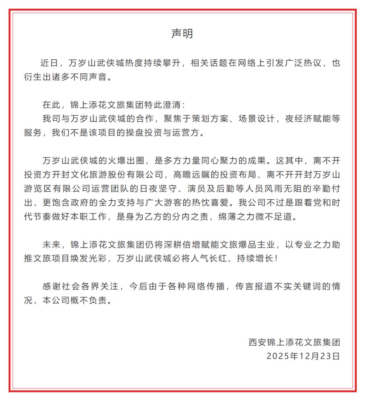 锦上添花文旅在声明中称:万岁山武侠城的火爆出圈,是多方力量同心聚力的成果。这其中,离不开投资方开封文化旅游股份有限公司,高瞻远瞩的投资布局、离不开开封万岁山游览区有限公司运营团队的日夜坚守、演员及后勤等人员风雨无阻的辛勤付出,更饱含政府的全力支持与广大游客的热忱喜爱。我公司不过是跟着党和时代节奏做好本职工作,是身为乙方的分内之责,绵薄之力微不足道。未来,锦上添花文旅集团仍将深耕倍增赋能文旅爆品主业,以专业之力助推文旅项目焕发光彩,万岁山武侠城必将人气长红、持续增长!感谢社会各界关注,今后由于各种网络传播,传言报道不实关键词的情况,本公司概不负责。