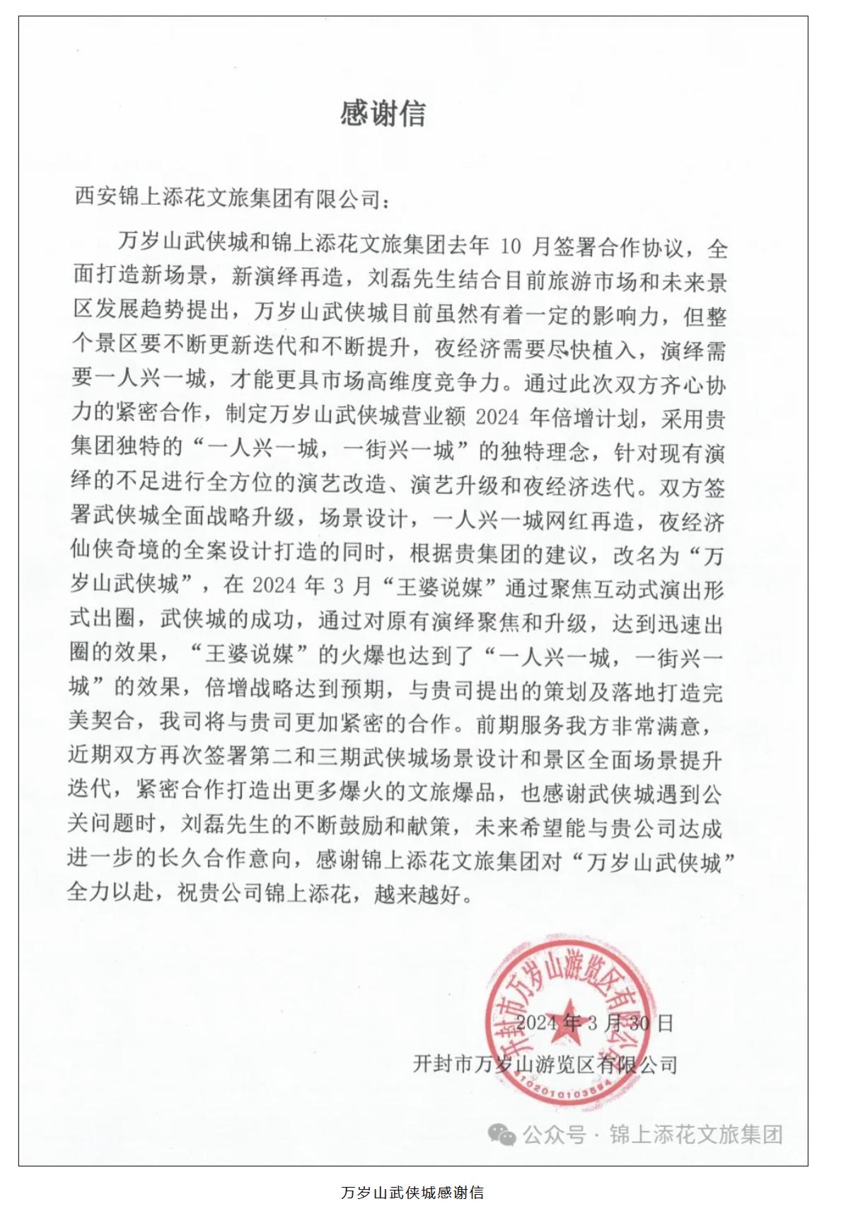 在这封感谢信中,万岁山游览区有限公司表示,通过此次双方齐心协力的紧密合作,制定万岁山武侠城营业额2024年倍增计划,采用贵集团独特的“一人兴一城,一街兴一城”的独特理念,针对现有演绎的不足进行全方位的演艺改造、演艺升级和夜经济迭代。双方签署武侠城全面战略升级,场景设计,一人兴一城网红再造,夜经济仙侠奇境的全案设计打造的同时,根据贵集团的建议,改名为“万岁山武侠城”,在2024年3月“王婆说媒”通过聚焦互动式演出形式出圈,武侠城的成功,通过对原有演绎聚焦和升级,达到迅速出圈的效果,“王婆说媒”的火爆也达到了“一人兴一城,一街兴一城”的效果,倍增战略达到预期,与贵司提出的策划及落地打造完美契合,我司将与贵司更加紧密的合作。