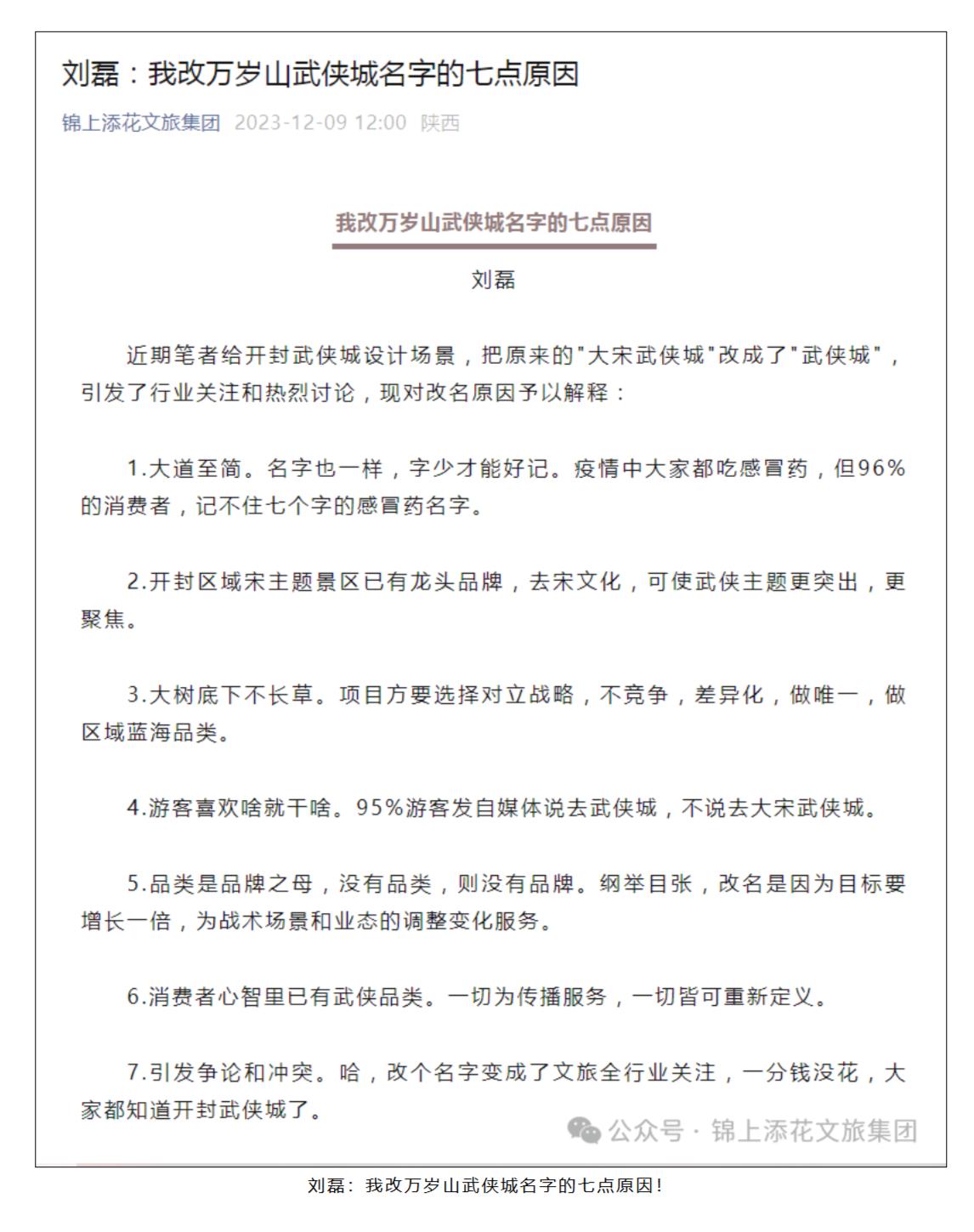 锦上添花文旅官方微信公众号的这篇文章特别提到:改造的第一步,就是改名。2023年11月,锦上添花文旅集团董事长刘磊先生力排众议,建议将原景区名“万岁山·大宋武侠城”改名为“万岁山武侠城”,此举引发了行业关注和热烈讨论。对此,刘磊也曾给出了“我改万岁山武侠城名字的七点原因!”事实证明,万岁山武侠城的改名,大获成功。正如锦上添花文旅集团董事长刘磊说的那样:“改个名字变成了文旅全行业关注,一分钱没花,大家都知道开封武侠城了。”