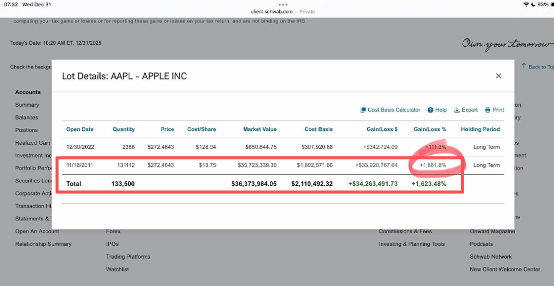 毕竟,段永平管理的不止一个账户,而是有50多个账户,不少还是替别人管理。他晒出的另一只账户(目前已被他删除),同样是持有苹果,持有11年,收益895%,年化大约18%。