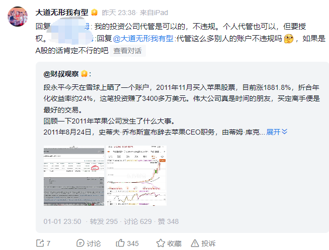 作为个人,不少股民质疑:替别人管理账户是否违规,是否是无照驾驶?段永平也进行了回应:我的投资管理代管是可以的,不违规;个人代管也可以,但要授权。