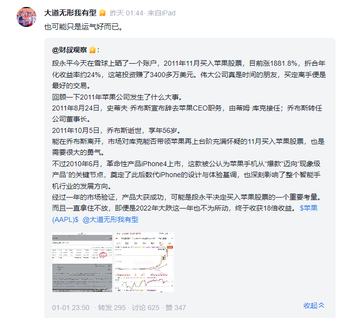 不少股民认为,段永平只是吃到了“时代的红利”或者“运气好”:“段的确吃到了这10年的红利,1-2年真不一定能吃到红利,美股爆发也是这5年的事”。