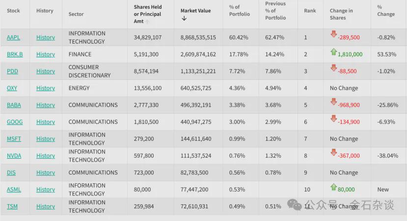 他还增持了巴菲特旗下的伯克希尔,期末持股市值增至26亿美元,占总持仓的比例也升至14.24%,稳居第二大重仓股。