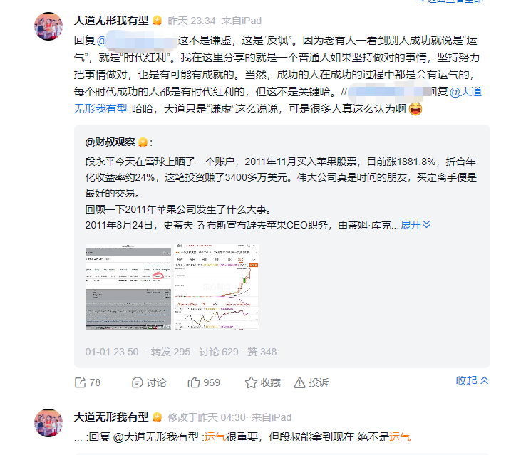对于段永平“吃时代红利”之说,段永平先是表示“可能只是运气好而已”。后来他回复评论区表示:不是谦虚是反讽,因为老有人一看到别人成功就说是“运气”,就是“时代红利”。我在这里分享的就是一个普通人如果坚持做对的事情,坚持努力把事情做对,也是有可能有成就的。当然,成功的人在成功的过程中都是会有运气的,每个时代成功的人都是有时代红利的,但这不是关键哈。