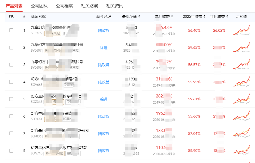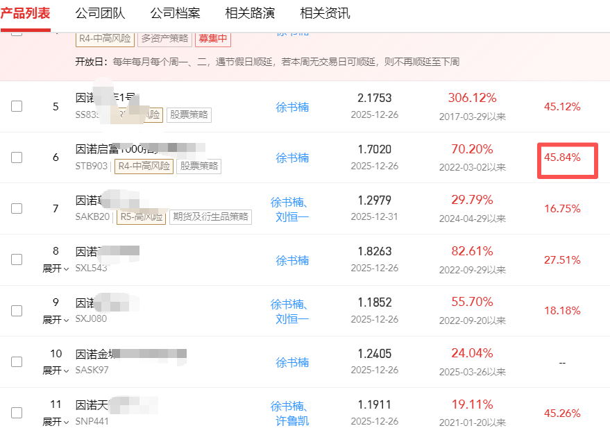 此外,平方和的指增产品收益基本也在50-70%,2025年首次跻身百亿私募行列;世纪前沿指增也几乎在50%左右,但是量化对冲策略收益不足15%,基准都没跑赢;因诺也是,指增能做到45%,但是CTA、衍生品策略等均不足20%。