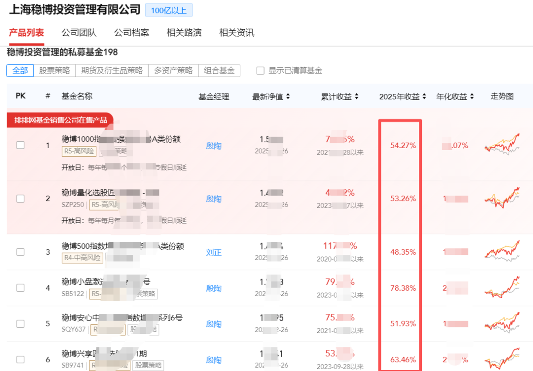 百亿私募大厂稳博投资同样如此,旗下私募量化也清一色的收益超50%,甚至有逼近80%的业绩。