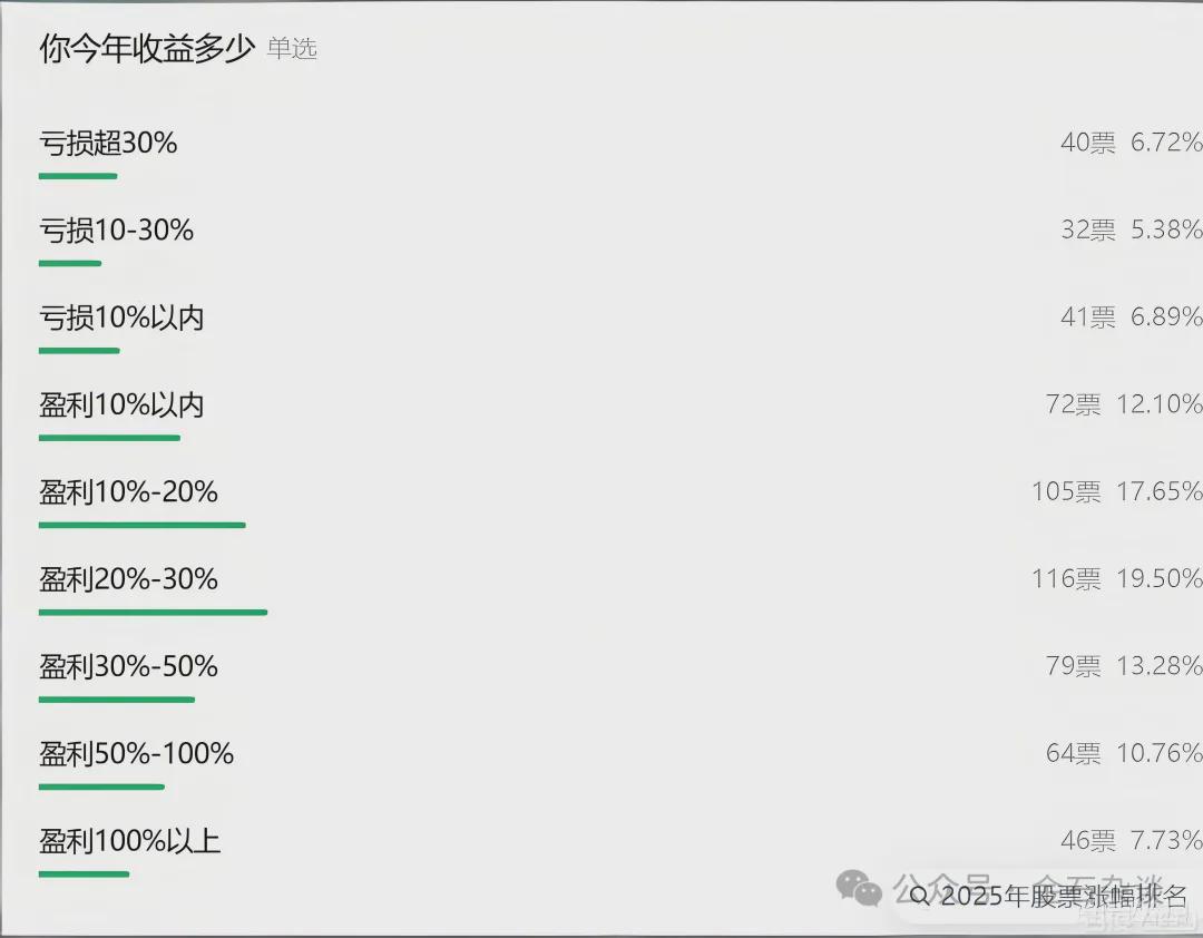 此前,金石杂谈统计,A股涨幅中位数为22%,股民人均赚近3万,在金石杂谈公众号上, 在595人的投票中,亏损股民不足20%,盈利超50%的股民有18%,盈利超100%的有7.73%。
