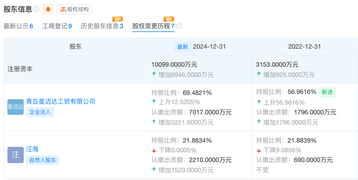 2022年6月,星迈达增资入主双星名人集团,一举成为控股股东;2024年5月再度加码,持股比例升至69.48%。汪海退至第二大股东,持股21.88%。