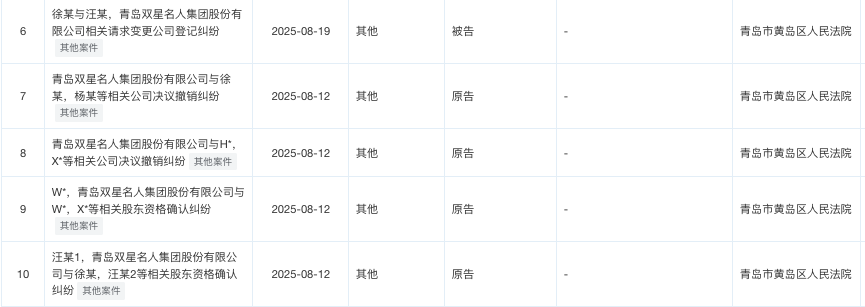 3个月后,汪海又将儿子儿媳诉至法庭。2025年8月,青岛市黄岛区人民法院发布了两起与双星名人集团有关的庭审公告。