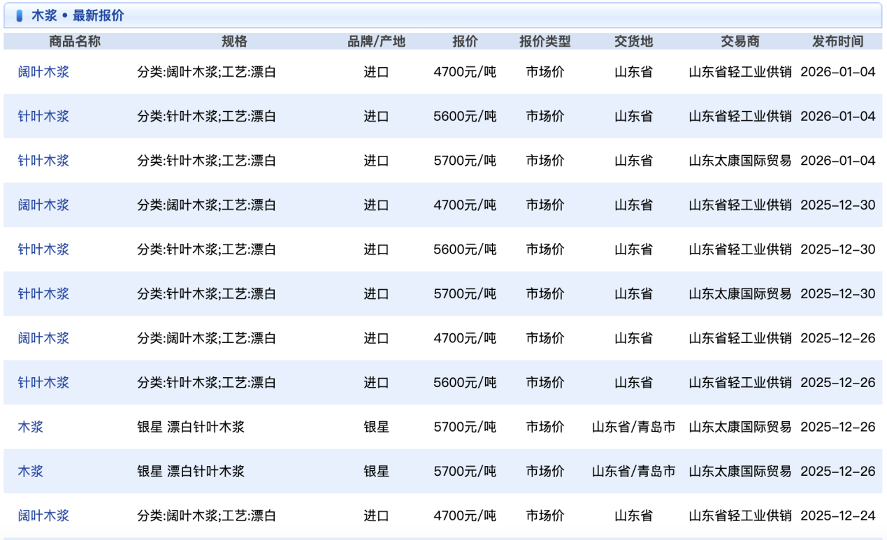 生意社2026年1月4日数据显示,木质素上游产品阔叶木浆和针叶木浆的进口价格分别为4700元/吨、5600元/吨,二者相差900元/吨。