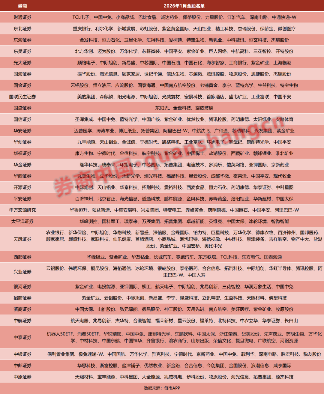 整体来看,有色板块在1月获得券商一致青睐,紫金矿业被10家券商扎堆推荐,是当之无愧的“人气王”。此外,电子、机械、非银板块也有不俗人气。