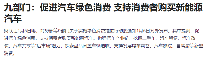 商务部等9部门关于实施绿色消费推进行动的通知1月5日对外发布。其中提到,促进汽车绿色消费。