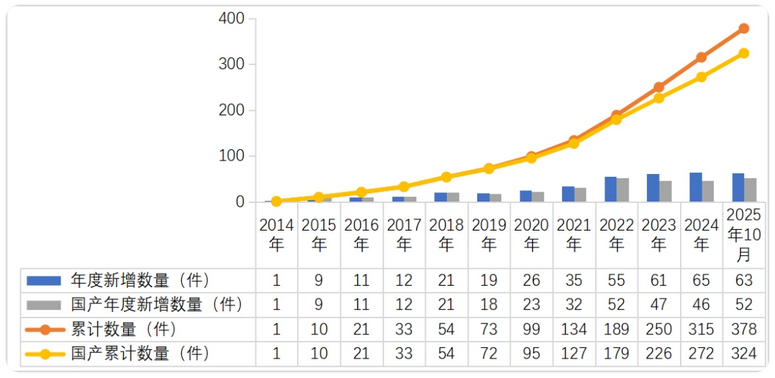 值得一提的是,国内医疗器械创新产品的数量也在快速增长。根据国家药品监督管理局的数据,2025年1月至10月,国家药品监督管理局批准创新医疗器械63个,较上年同期增长28.57%,增速高于同期17.2个百分点,数量续创新高。截至2025年10月底,国家药品监督管理局累计批准创新医疗器械378个,高端器械的可及性得到明显提升。