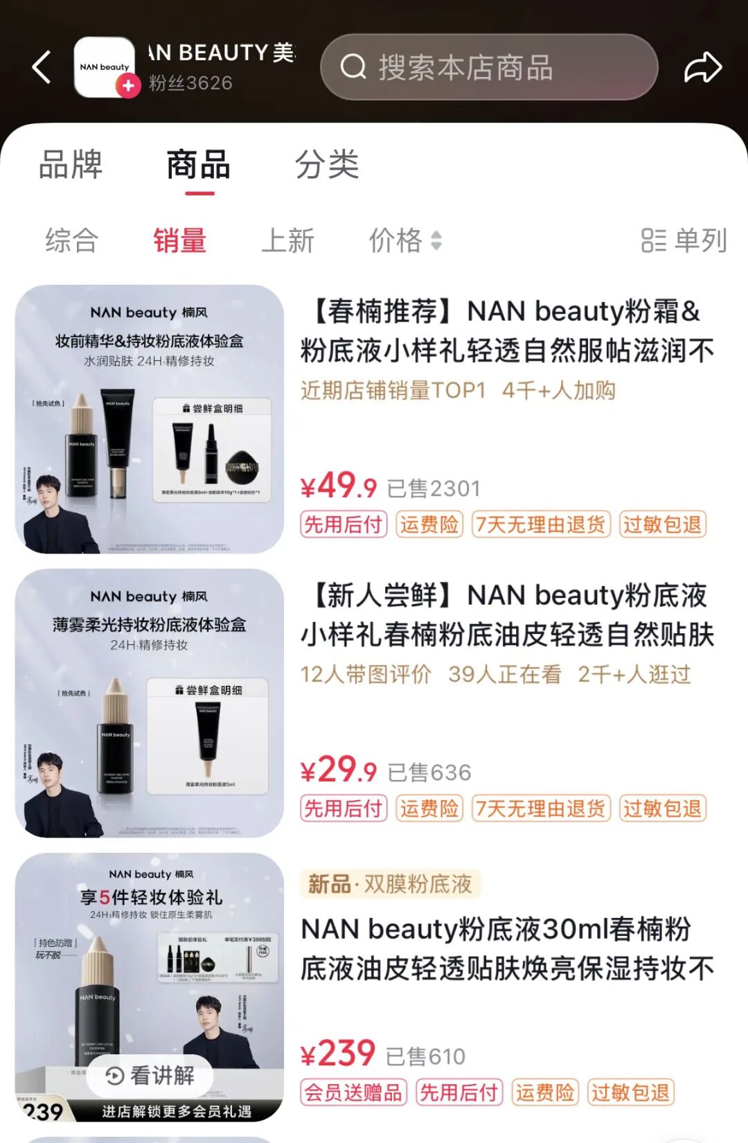 抖音美妆旗舰店中,按产品销量排序可以看到,NAN beauty品牌销售最好的一款产品是粉霜&粉底液的小样组合装,售价49.9至59.9元,已售2301单;排名第二的粉底液小样单品,售价29.9元,已售636单;售价239元的“贴贴粉底液”正装卖出610单,销量排名第三。